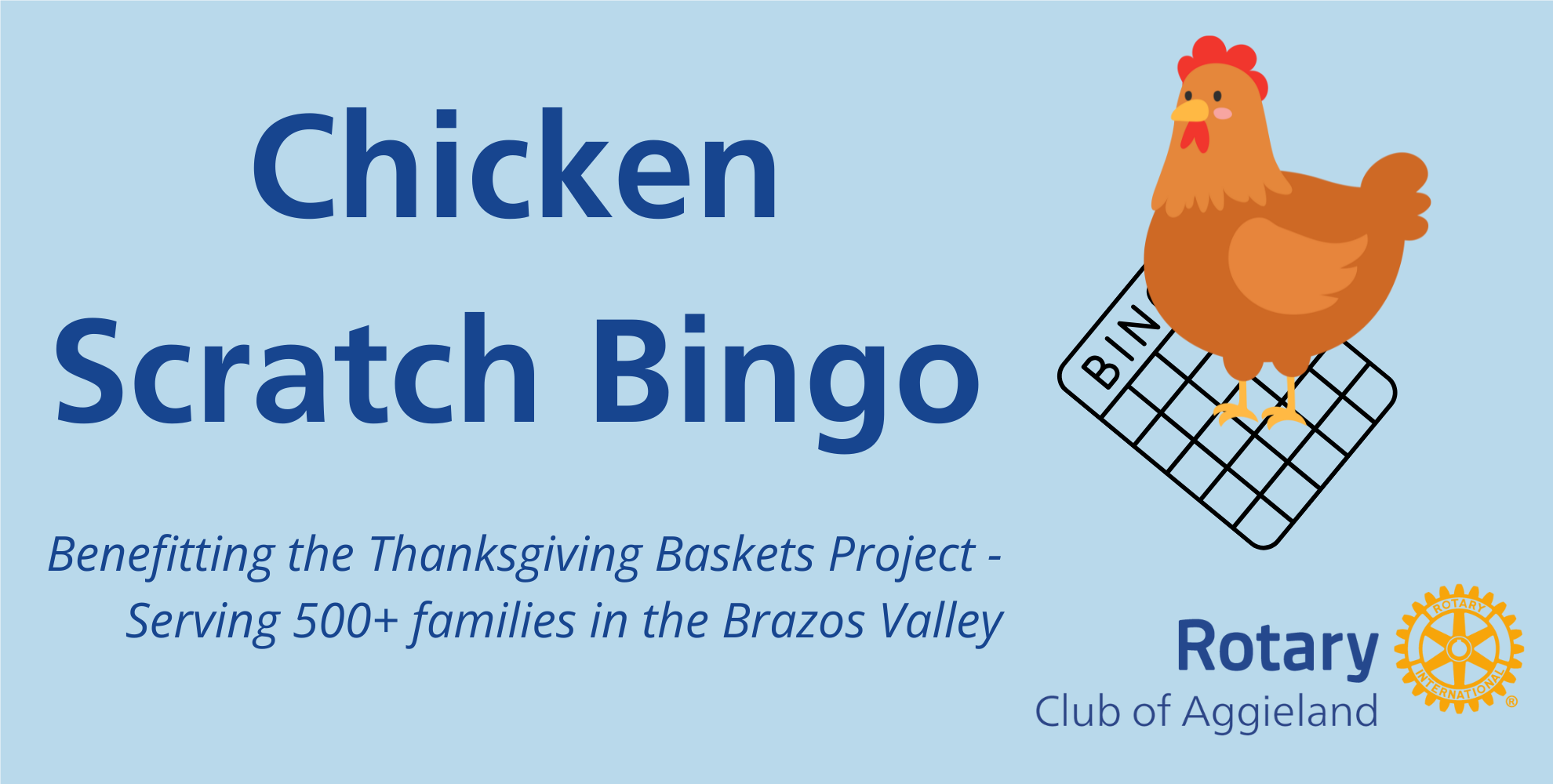 All proceeds of The Rotary Club of Aggieland Chicken Scratch Bingo go to support charitable projects right here in our community. Our Club's signature project is our Thanksgiving Baskets each November. This project provides 500+ Thanksgiving Baskets with the fixings to make a dinner for families experiencing food insecurity in the Brazos Valley.